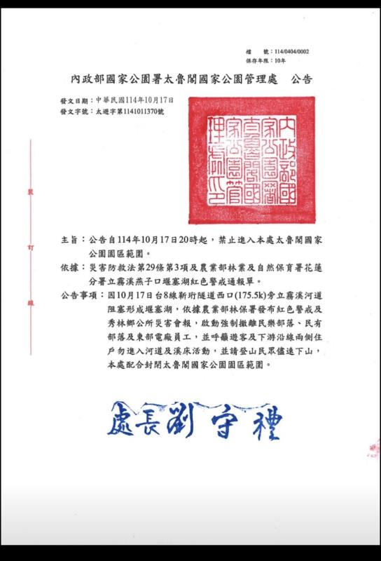 公告自114年10月17日20時起,禁止進入本處太魯閣國家公園園區範圍