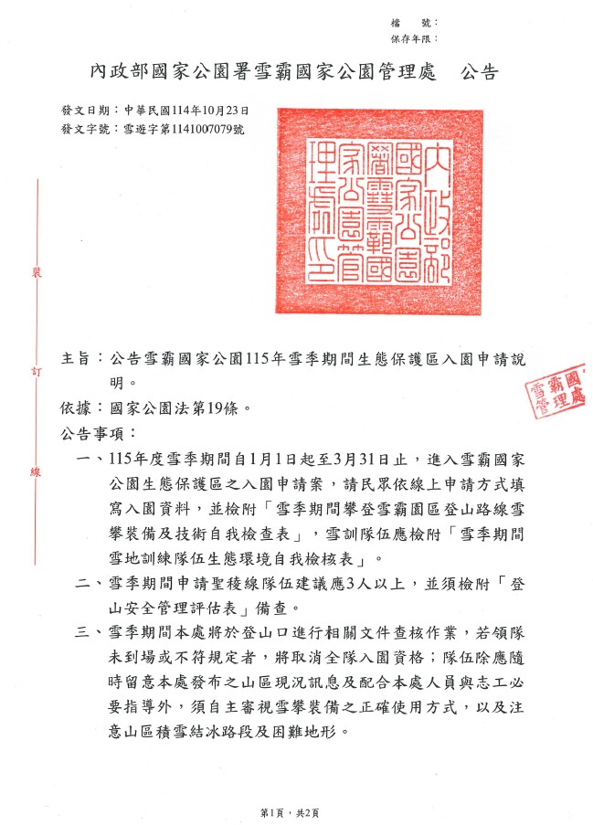 一、115年度雪季期間自1月1日起至3月31日止,進入雪霸國家公園生態保護區之入園申請案,請民眾依線上申請方式填寫入園資料,並檢附「雪季期間攀登雪霸園區登山路線雪攀裝備及技術自我檢查表」,雪訓隊伍應檢附「雪季期間雪地訓練隊伍生態環境自我檢核表」。