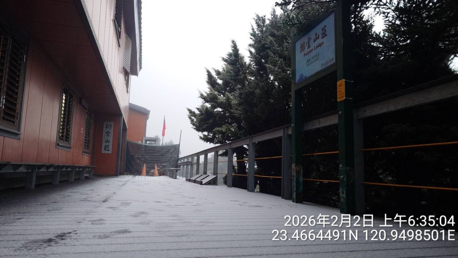 圖說:玉山北峰氣象站及排雲山莊於2/2早上降雪。