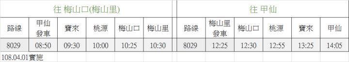 去程:「甲仙站」發車時間08:50、到達「梅山口」時間10:25。