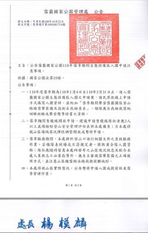 雪霸處配合山林開放政策並為維護園區內之高山生態系,將自110年1月4日起至3月31日進行雪季服務相關管理,實施雪季期間入園申請規定,並分為一般申請案及雪地訓練申請案,有關規定詳細說明,請連結:https://hike.taiwan.gov.tw/news_3.aspx並下載