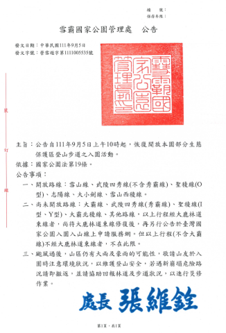 主旨:公告自111年9月5日上午10時起,恢復開放本園部分生態保護區登山步道之入園活動。