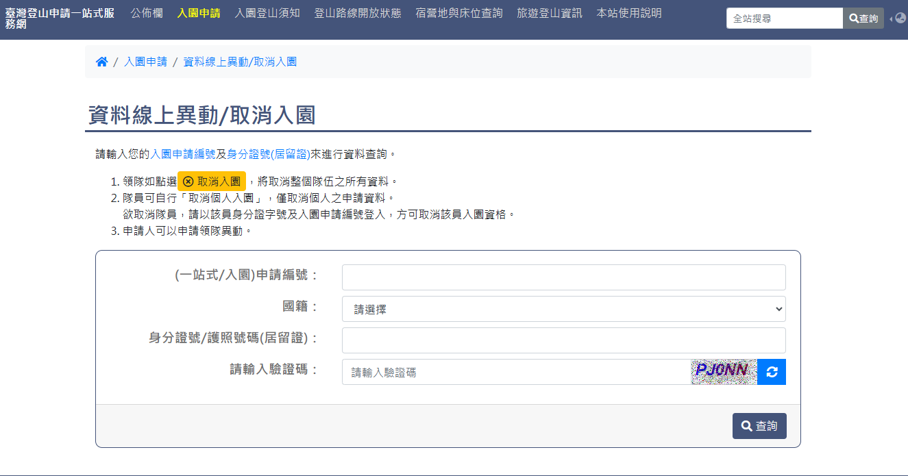 行程中有申請九九山莊住宿之隊伍,目前不接受線上更換領隊。(請填寫紙本領隊異動申請書,最遲於入園日前3個工作日提出)
