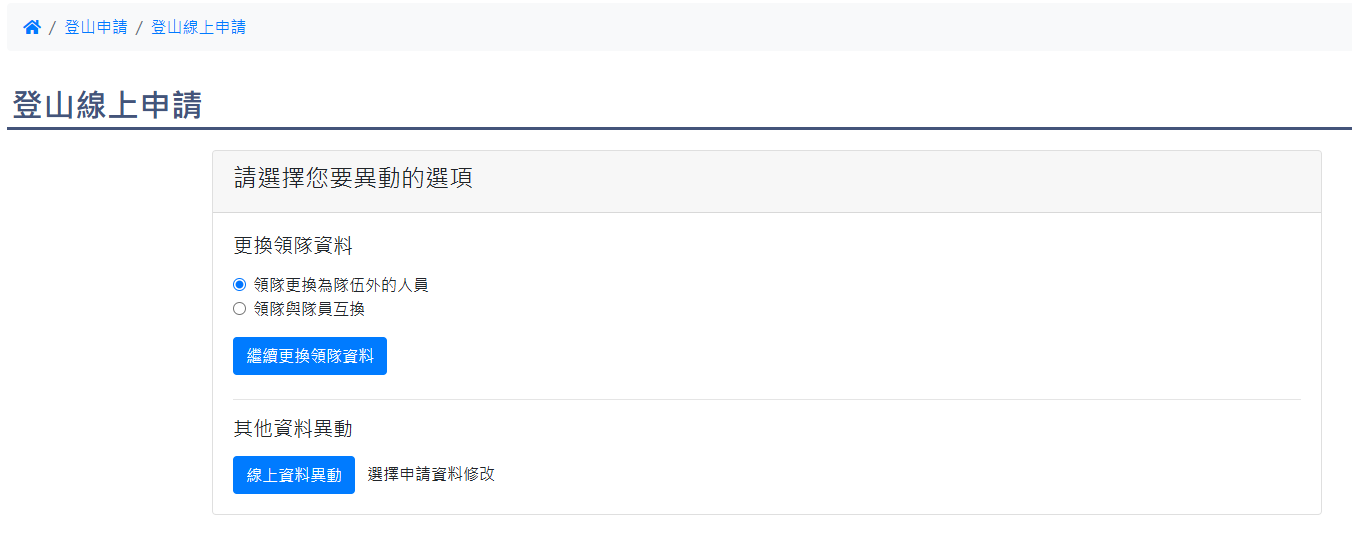 獨攀隊伍不得更換領隊,若有異動需求,請山友自行退件重新申請。